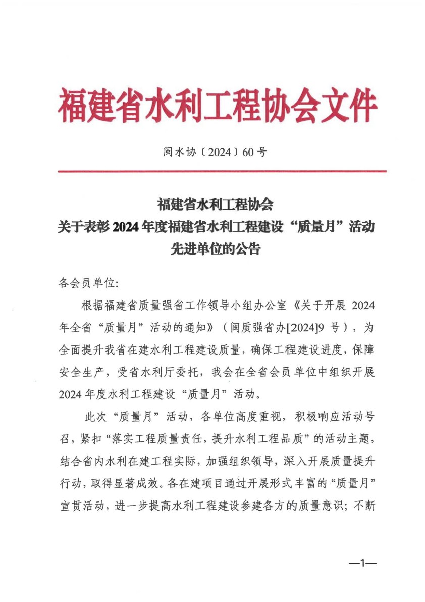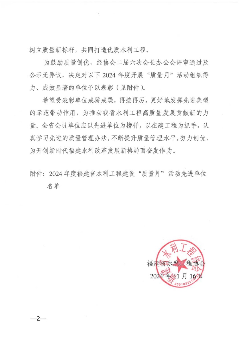荣获先进单位称号,既是对我司过去成绩的肯定,也是对未来工作的鞭策。我们将以此为契机,进一步加强质量管理,提升工程品质,为推动福建省水利工程建设事业的持续发展贡献更大力量。同时,我们也期待与更多同行交流合作,共同推动水利工程建设行业的进步与发展。